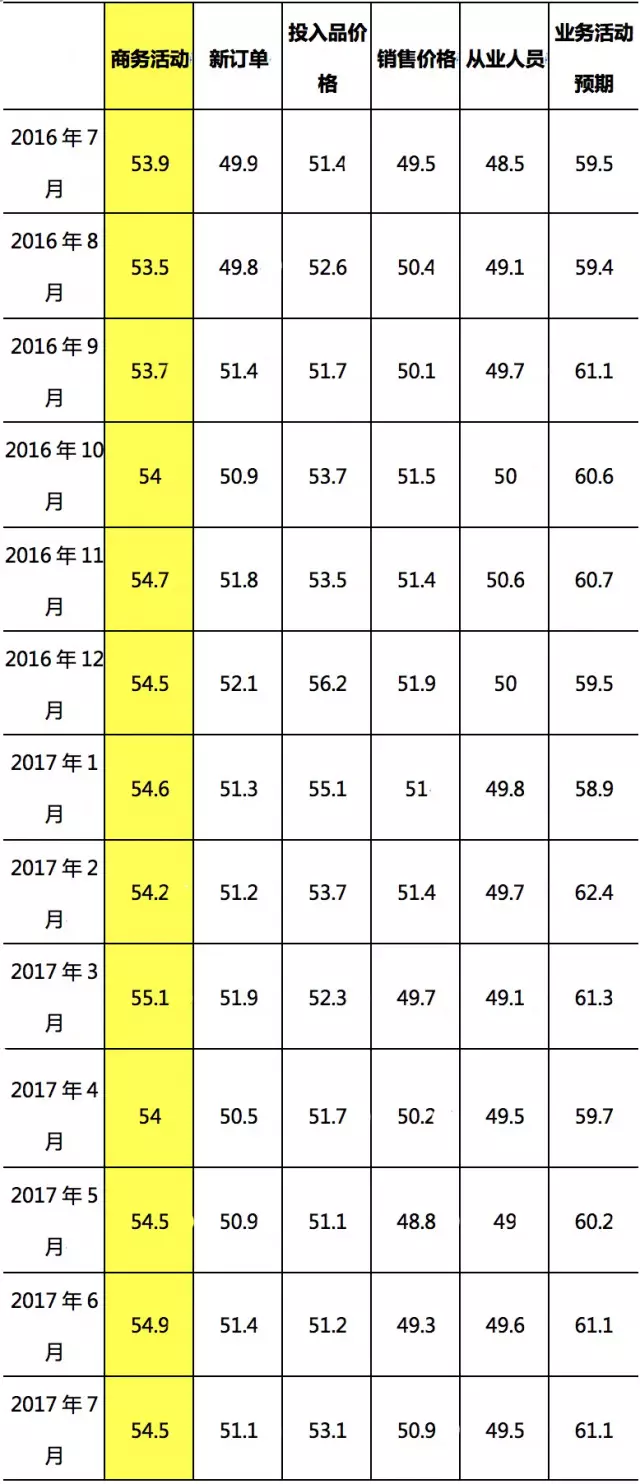 从分类指数看,正在形成制制业PMI的5个分类指数中,出产指数、新订单指数和供应商配送时间指数高于临界点,原材料库存指数和从业人员指数低于临界点。阐发:7月制制业PMI小幅回落,但总体走势平稳。大型企业PMI为52。9%,持续两个月回升,这是比力大的亮点。申明正在取去杠杆强束缚下,中小企业削减出产,或被裁减。产物供给的削减激发价钱的快速上涨,国企为代表的大型企业顺势去库存,景气宇也随之回升。新的环保督查曾经展开,估计下半年这种演变逻辑将继续延续。2017年7月份,中国非制制业商务勾当指数为54。5%,虽比上月回落0。4个百分点,但取上半年均值根基持平,非制制业继续连结稳中向好的成长势头。分行业看,办事业商务勾当指数为53。1%,比上月回落0。7个百分点,但高于客岁同期0。5个百分点,办事业延续了较快增加态势。