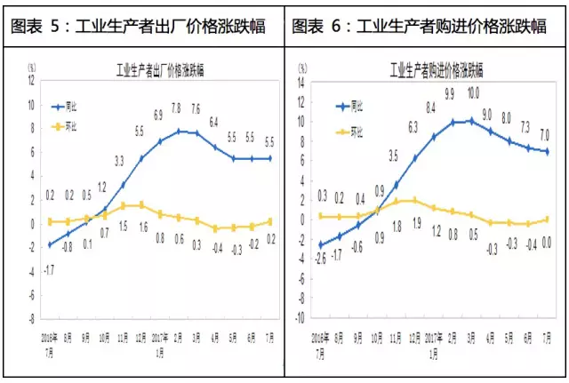 据测算,正在7月份1。4%的同比涨幅中,客岁价钱变更的翘尾要素约为1。0个百分点,新跌价要素约为0。4个百分点。阐发:7月CPI同比上涨1。4%,低于市场预期。需求端相对不变,价钱变化次要受供给端影响。从目前趋向来看,下半年CPI将继续低位运转。去杠杆布景下,虽然CPI连结低位,可是不会改变货泉政策的收紧标的目的。2017年7月份,全国工业出产者出厂价钱同比上涨5。5%,环比上涨0。2%。工业出产者购进价钱同比上涨7。0%,环比持平。