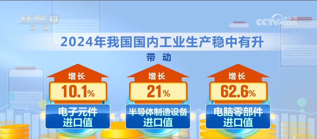 2024年,我国进口规模不竭扩大,不只满脚了国内出产需要,也丰硕了消费选择。客岁,我国国内工业出产稳中有升,带动电子元件、半导体系体例制设备、电脑零部件进口值别离增加10。1%、21%、62。6%;铁矿砂、天然气、煤等大商品进口量别离添加4。9%、9。9%、14。4%。同期,我国很多平易近生消费品的进口需求较为兴旺,如服拆、生果、8。6%、38。8%。