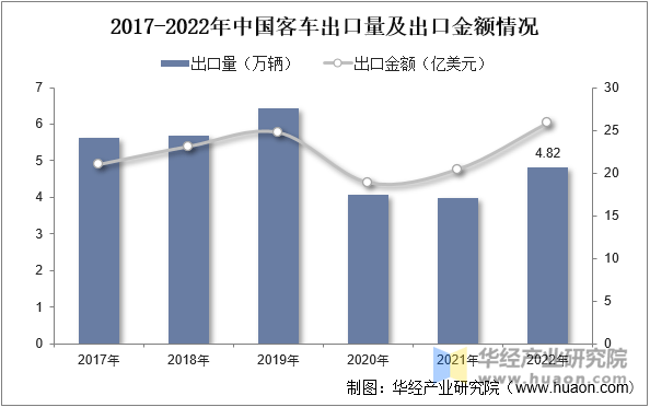 我国客车次要以出口商业为从,出口规模弘远于进口规模。跟着近年来我国客车行业的不竭成长,我国客车出口规模也随之不竭扩张,2020年受疫情影响,全球客运蒙受严沉冲击,市场需求大幅下降,使得我国客车出口规模呈现大幅度下降。跟着疫情被无效节制,全球市场需求逐渐回升,出口规模起头逐渐回升。据材料显示,2022年我国客车出口量为4。82万辆,同比增加21。1%;出口金额为25。8亿美元,同比增加26。6%。